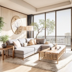 jianzhu, Modern  living room, natural light, wood grain, bonsai, large windows, gray sofa, coffee table, potted plants, books, artwork, decorative ornaments, curtains, balcony, cityscape, high-rise buildings, sunlight, shadows, stylish, shoji, tatami<lora:jianzhu-000009:0.8>