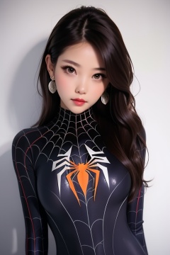 spiderman cosplay,1girl,long hair,looking at viewer,brown hair,brown eyes,earrings,bodysuit,spider web,head tilt,simple background,<lora:lbc_spiderman_ycc_240401_v1.0-000008:0.8>,