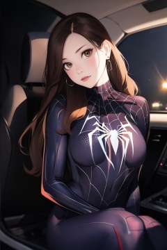 spiderman cosplay,1girl,long hair,looking at viewer,brown hair,brown eyes,earrings,bodysuit,spider web,head tilt,vehicle background,car interior,black background,<lora:lbc_spiderman_ycc_240401_v1.0-000008:0.8>,