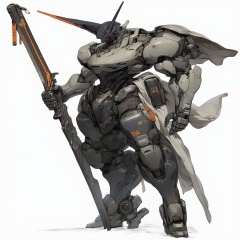 robot, rough, weapon, holding, holding weapon, sword, solo, white background, holding sword, no humans, standing, science fiction, simple background, red eyes, horns, full body, open hand, armor, 1boy, glowing, single horn, gun