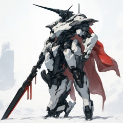 robot, rough, holding, weapon, holding weapon, no humans, solo, standing, science fiction, polearm, holding polearm, single horn, open hand, cape, horns, armor, full body, holding sword, sword, white background, looking ahead, redesign,