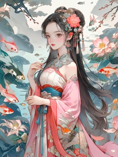 guofeng,Illustrated,1girl,black eyes,long hair,super precise depiction,(flowers),multiple colors,high definition,Rich in intricate details. 8K,illustration,crazy colors,tress,(full body:2),wide shot,fish,1girl,hanfu,pink,off-shoulder,<lora:Dream Scenery XL:0.5>,<lora:国风插画SDXL:0.8>,<lora:20230923-1695416757638:0.8>,