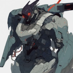 robot, rough sketch, flat color, no humans, science fiction, white background, solo, red eyes, cable, simple background, glowing, looking ahead, glowing eyes, standing, upper body, glowing eye