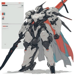 robot, rough sketch, flat color, holding, weapon, holding weapon, no humans, solo, standing, science fiction, polearm, holding polearm, open hand, cape, armor, full body, holding sword, sword, white background, looking ahead, redesign,