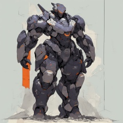 robot, rough sketch, flat color, illustration, armor, solo, 1boy, helmet, looking at viewer, science fiction, glowing, orange eyes, no humans, glowing eyes, power armor, standing, full body