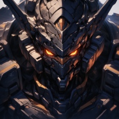 robot, armor, solo, 1boy, helmet, upper body, looking at viewer, white background, science fiction, glowing, orange eyes, no humans, simple background, katana, glowing eyes, power armor,