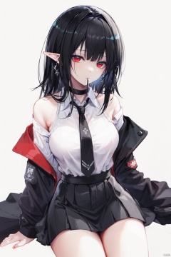 1girl, solo, red eyes, bare shoulders, long hair, white background, simple background, necktie, artist name, skirt, black skirt, mouth hold, signature, hairband, shirt, black necktie, grey hair, black jacket, bangs, jacket, long sleeves, pointy ears, sitting, black choker, thighs, off shoulder, black hairband, choker, white shirt, red nails, earrings, cowboy shot, nail polish
