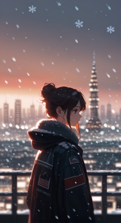 score_9,score_8_up,impressionism,summer,winter,sunset,1girl's back,marvelous,cityscape,depth of field,snowing,