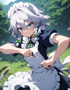 1girl, izayoi sakuya, touhou, solo, maid headdress, maid, apron, short sleeves, dress, closed mouth, white apron, looking at viewer, maid apron, puffy short sleeves, frills, puffy sleeves, black dress, frilled apron, hair between eyes, outdoors, blush, throwing knives, knives, serious face, upper body, masterpiece, best quality, very aesthetic, absurdres