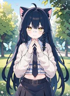 (masterpiece, highres, best quality, nice hands, perfect hands), ((zeyan, ((1girl:1.5)), dark blue hair, yellow eyes, very long hair, straight hair:1.5, ahoge, single braid, cat ears, bandaid:1.5, blue necktie, crop top, beige sweater vest, white shirt, blue skirt, happy, looking at viewer, )),<lora:NewZeyanV1:0.45:lbw=CHARACTER>, <lora:GoodHands-beta2:1>, butterfly garden, surrounded by fluttering butterflies, sunlight filtering through leaves, spring,