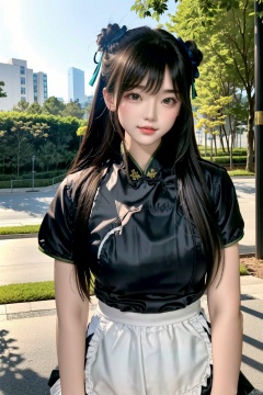 1girl, zhonghuaniang, green, sitting, outdoors, city, park, upper body, 1 girl