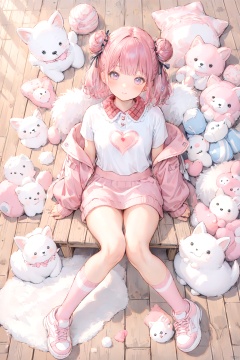 1girl,the character has pink hair with two large pink buns,wearing a white top with a pink fluffy collar,a pink jacket with white fur lining,pink knee-high socks,and pink sneakers with a white design she is sitting on a wooden surface,surrounded by three small pink plush toys,one of which has a red heart on its chest,from above, paleColor