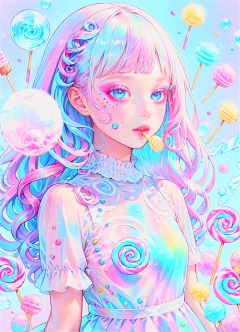 beautiful kawaii naughty girl, hyper detailed, cotton candy curly hair, candy freckles, bright makeup, holographic transparent candy dress, close-up portrait, highly detailed illustration, candyland character design, surrounded by swirls of ice cream and cream butter Pale pastel colors, bubblegum bubbles, gradient background. the candy girl, paleColor