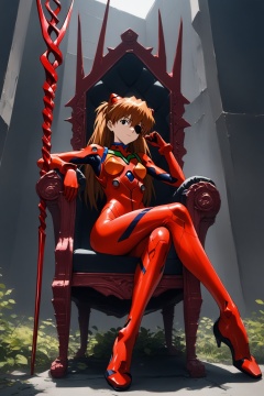 1girl, souryuu asuka langley, neon genesis evangelion, rebuild of evangelion, lance of longinus, cat hat, plugsuit, pilot suit, red bodysuit, sitting, crossed legs, black eye patch, throne, looking down, from bottom, looking at viewer, outdoors, masterpiece, best quality, very aesthetic, absurdres