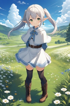 Makoto Shinkai style,1girl, solo, long hair, looking at viewer, smile, bangs, thighhighs, dress, twintails, jewelry, green eyes, standing, full body, flower, white hair, earrings, boots, outdoors, sky, day, pointy ears, belt, black thighhighs, white dress, capelet, brown footwear, arms behind back, grass, elf, white capelet, lalafell