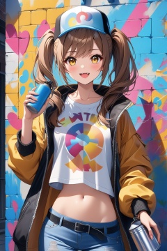 best quality,high resolution,distinct image,best quality,high resolution,distinct image,Original Characters,Natural Volumetric Lighting And Best Shadows,Deep Depth Of Field,Sharp Focus,Portrait Of Stunningly Beautiful Petite Girl,Soft Delicate Beautiful Attractive Face With Alluring Yellow Eyes,Lovely Small Breasts,Sharp Eyeliner,Seductive Smiling,Open Mouth With Cute Fangs Out,Windswept Disheveled Brown Hair,Thick Layered Medium Twintail Hairstyles,Blush Eyeshadow With Thick Eyelashes,Parted Lips,Applejack Hat,Oversized Pop-Art Jacket,Slim Waist With Open Cute Navel,Denim Jeans Pants With Buckle Belt,(Messy Painted Body:1.05),(Holding Spray Paint Can:1.1),(Graffiti Murals Wall Background:1.15),(Standing On Narrow City Streets Crossword:1.2),(Highest Quality, Amazing Details:1.4),Masterpiece,Bloom,Picturesque,Brilliant Colorful Paintings,masterpiece,Hd,