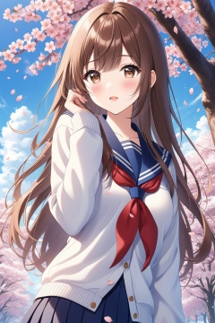 1girl, solo, long hair, looking at viewer, blush, open mouth, bangs, skirt, brown hair, shirt, long sleeves, brown eyes, school uniform, standing, upper body, flower, outdoors, parted lips, sky, serafuku, day, hand up, sailor collar, tree, blue sky, neckerchief, sleeves past wrists, petals, cardigan, blue sailor collar, cherry blossoms, red neckerchief, white cardigan