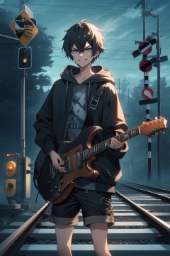 hoodie, shorts, very short hair, evil smile, 1boy, guitar, railroad crossing,
