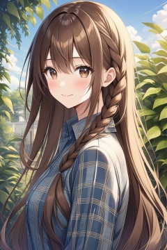 1girl, solo, long hair, looking at viewer, blush, smile, bangs, brown hair, shirt, long sleeves, hair between eyes, brown eyes, very long hair, closed mouth, upper body, braid, outdoors, day, collared shirt, looking to the side, plaid, plant, plaid shirt