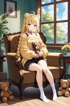 1girl, solo, long hair, looking at viewer, blush, bangs, blonde hair, long sleeves, bow, animal ears, bare shoulders, brown eyes, sitting, collarbone, full body, yellow eyes, braid, ahoge, parted lips, shorts, choker, day, socks, puffy sleeves, indoors, off shoulder, :o, sweater, sleeves past wrists, short shorts, window, single braid, bell, black choker, chair, no shoes, black shorts, stuffed toy, stuffed animal, white socks, couch, teddy bear, wooden floor, on couch, brown sweater, on chair, off-shoulder sweater, armchair, yellow sweater