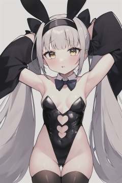 1girl, animal ears, breasts, rabbit ears, solo, covered navel, small breasts, blush, twintails, thighhighs, long hair, white background, arms up, looking at viewer, simple background, hairband, armpits, detached collar, sweat, yellow eyes, bow, very long hair, bunny pose, bangs, blunt bangs, white hair, wrist cuffs, pout, low twintails, playboy bunny, cowboy shot, bowtie, thigh gap, black thighhighs, official alternate costume