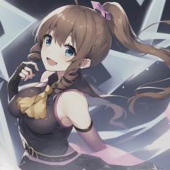 1girl, gloves, elbow gloves, solo, fingerless gloves, smile, single elbow glove, blue eyes, open mouth, hair ornament, belt, looking at viewer, ascot, personification, ahoge, breasts, cup, :d, skirt, sleeveless, medium breasts, black gloves, single glove, brown hair, mug, bare shoulders, drill hair, asymmetrical gloves, tareme, hologram, side ponytail