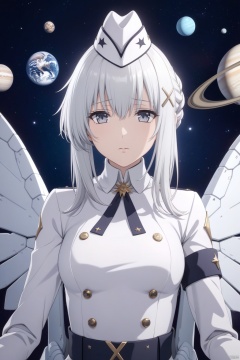 masterpiece, best quality, incredibly absurdress, highres, high detail eyes,1girl,solo,hair between eyes,blush,masterpiece,soft tender eyes,best quality,white hair,grey eyes,long hair,cosmos background,planets,cowboy shot,liv,wings,white coat,hat,pov