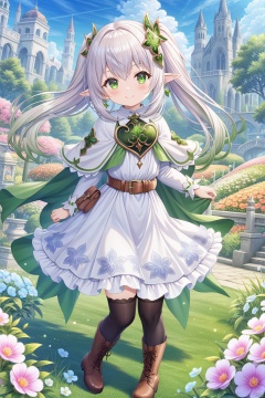 Shinkai Style, background blur, Depth of field, game scene, masterpiece, HD, best quality, 16k,1girl, solo, long hair, looking at viewer, smile, bangs, thighhighs, dress, twintails, jewelry, green eyes, standing, full body, flower, white hair, earrings, boots, outdoors, sky, day, pointy ears, belt, black thighhighs, white dress, capelet, brown footwear, arms behind back, grass, elf, white capelet, lalafell, uafs, nahida