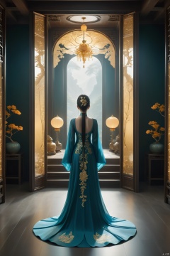 Surrealistic scenes,Weird architecture,Conceptual design,realism,surrealism,3D rendering,(Mirror Walker),(((from behind))),(front and back, no face, back to the audience, long hair on the back, back display),(perfect head details, clean and sleek rear-view head),(((hands_on_own_chest))),(in front of the mirror, 1 woman in a gorgeous golden hanfu cape is standing quietly, with long floating hair.),