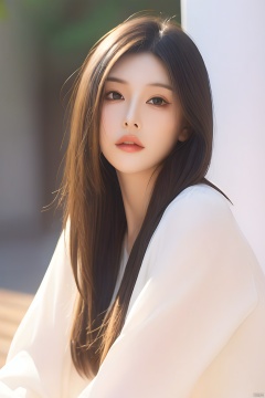 Best quality, masterpiece, ultra high res, (photorealistic:1.2), a girl,Depth of field, golden hour, (rim lighting:1.1), soft shadows, vibrant colors, hazy glow, painterly effect, dreamy atmosphere,A clear face,Black hair, long hair, straight hair, white clothes,Perfect facial features,Amazing beauty,
