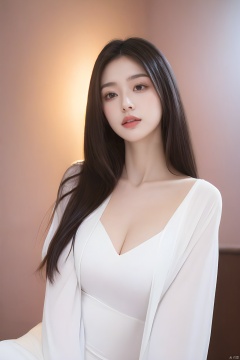 Best quality, masterpiece, ultra high res, (photorealistic:1.2), a girl,Depth of field, golden hour, (rim lighting:1.1), soft shadows, vibrant colors, hazy glow, painterly effect, dreamy atmosphere,A clear face,Black hair, long hair, straight hair, white clothes,Medium-sized *******,Perfect facial features,Amazing beauty,collarbone, ********, slender waist,Half-length photo,