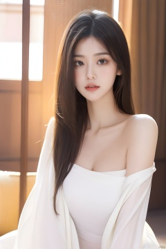 Best quality, masterpiece, ultra high res, (photorealistic:1.2), a girl,Depth of field, golden hour, (rim lighting:1.1), soft shadows, vibrant colors, hazy glow, painterly effect, dreamy atmosphere,A clear face,Black hair, long hair, straight hair, white clothes,Perfect facial features,Amazing beauty,collarbone, slender waist,Half-length photo,