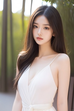 Best quality, masterpiece, ultra high res, Outdoor,(photorealistic:1.4), a girl,Depth of field, soft shadows, hazy glow, painterly effect,A clear face,Black hair, long hair, straight hair, white clothes,Amazing beauty,collarbone, slender waist,Sling dresses, sleeveless, tight clothes,