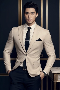1man,Asian,solo,male focus,exquisite facial features,handsome,muscular,Confident Dressing,exquisite facial features,handsome,deep eyes,muscular,formal suit,shirt,necktie,pants,Tailored Fit,Quality Fabrics,graceful yet melancholic posture,masterpiece,realistic,best quality,highly detailed,blurry, jzns