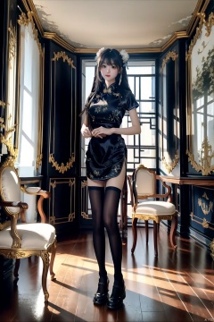 1girl, zhonghuaniang, black dress, standing,indoors, full body,thighhigh, ((rococo)), window,chair,painting_(medium)