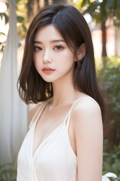 Best quality, masterpiece, ultra high res, Outdoor,(photorealistic:1.4), a girl,Depth of field, soft shadows, hazy glow, painterly effect,A clear face,Black hair, long hair, straight hair, white clothes,Amazing beauty,collarbone, slender waist,Sling dresses, sleeveless, tight clothes,