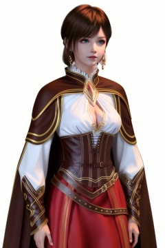 ((HRD, HUD, 8K)),((masterpiece, best quality)), highly detailed, soft light,1girl, solo, hair ornament, brown hair, short hair, bangs, green eyes, lips,jewelry, earrings, breasts, cleavage, corset, cleavage cutout, cape, simple background, (white background:1.2), cowboy shot, standing, looking at viewer, <lora:20240403-1712109093604:0.73>