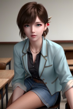 ((HRD, HUD, 8K)),((masterpiece, best quality)), highly detailed, soft light,1girl, solo, hair ornament, brown hair, short hair, bangs, green eyes, lips,earrings, (t-shirt:1.2), (blazer:1.2), denim shorts, black pantyhose, blurry background, classroom, chalkboard, sitting, cowboy shot, looking at viewer, <lora:20240403-1712109093604:0.7>