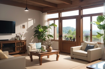 livingroom, jinchou, no humans, scenery, plant, couch, table, indoors, food, fruit, pillow, chair, television, plate, window, flower pot, carpet, flower, potted plant, shelf, vase