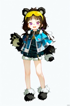 ((1girl)),1girl, solo, long hair, looking at viewer, smile, open mouth, bangs, simple background, brown hair, black hair, gloves, white background, animal ears, twintails, purple eyes, full body, shorts, barefoot, blunt bangs, see-through, fur trim, eyewear on head, animal hands, multicolored eyes, paw gloves, bear ears, feet