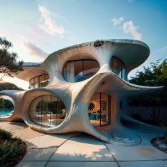 Organic architecture,bare tree,blue sky,cloud,cloudy sky,day,forest,nature,no humans,outdoors,palm tree,plant,scenery,sky,tree,water