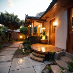 Organic architecture,architecture,building,bush,day,door,east asian architecture,fence,flower,forest,garden,grass,house,lamp,lantern,light,nature,night,no humans,outdoors,palm tree,paper lantern,path,pavement,plant,pond,potted plant,road,scenery,sky,stairs,star \(sky\),stone lantern,tree,tree shade,tree stump,wooden fence