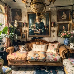 maximalism interior design ,album cover,analog clock,blonde hair,book,bookshelf,bottle,brown hair,candle,cat,clock,couch,fantasy,flower,globe,hat,jar,owl,painting \(object\),photo \(object\),plant,scenery,shop,skull,tiles,wall clock