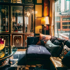 maximalism interior design ,architecture,bookshelf,building,city,cityscape,east asian architecture,no humans,scenery,window