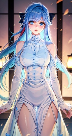 1girl, solo, long hair, breasts, looking at viewer, bangs, blue eyes, large breasts, long sleeves, dress, bow, bare shoulders, very long hair, blue hair, standing, hair bow, thighs, cowboy shot, parted lips, white dress,clothing cutout, buttons, blue bow, shoulder cutout