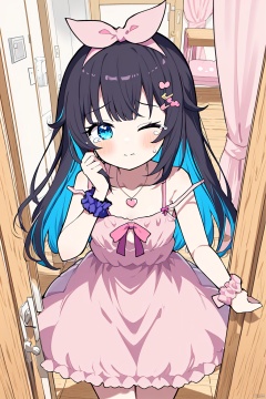 1girl, cat, blue eyes, rubbing eyes, dress, virtual youtuber, one eye closed, scrunchie, strap slip, solo, long hair, wrist scrunchie, indoors, bangs, doorway, multicolored hair, collarbone, heart, hair ornament, looking at viewer, jewelry, hairclip, bare shoulders, sleeveless dress, necklace, closed mouth, door, two-tone hair, brown hair, pink bow, hand up, pink dress, frilled dress, sleeveless, frills, bow, pink hair, wooden floor, hair bow, black hair, open door, wiping tears, colored inner hair, heart necklace, tissue box, pink ribbon, curtains