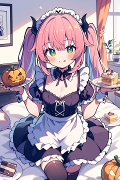 1girl, food, solo, breasts, dress, cleavage, black dress, thighhighs, tongue out, short sleeves, long hair, puffy short sleeves, heart, tongue, frills, green eyes, pillow, frilled apron, puffy sleeves, wrist cuffs, nail polish, smile, head wings, holding, frilled dress, medium breasts, apron, bangs, :q, horns, maid headdress, white apron, single thighhigh, maid, jack-o'-lantern, cake, looking at viewer, pink hair, twitter username, black thighhighs, blush, hair between eyes, frilled pillow, closed mouth, candy, red hair, on bed, twintails, indoors, halloween, plate, two side up, hands up,