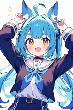 1girl, solo, usada pekora, virtual youtuber, smile, blue hair, long hair, looking at viewer, thick eyebrows, upper body, animal ears, bangs, white belt, blush, white choker, jacket, choker, rabbit ears, white background, open mouth, sailor collar, :d, two side up, open clothes, neckerchief, blue neckerchief, animal ear fluff, long sleeves, simple background, white sailor collar, arms up, bunching hair, shirt