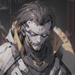 solo, looking at viewer, 1boy, jacket, male focus, blurry background, colored sclera, science fiction, cyborg, A robot, color, Larme Kei, 1girl
