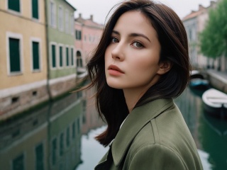 cinematic photo The image features a young woman as the central subject, standing outdoors with a thoughtful, almost wistful expression on her face. Her eyes are gazing softly into the distance, which, together with her slightly parted lips, conveys a sense of contemplation or daydreaming. She has dark, voluminous hair that cascades around her shoulders, moved slightly by what seems to be a gentle breeze, accentuating the natural movement and adding a dynamic quality to the photograph. The colors in the image are rich yet subdued, with the woman's olive green jacket blending harmoniously with the muted tones of the background, which hint at an urban environment with a body of water, possibly a canal, and architecture typical of a historic city center. The overcast sky suggests it might be a cool or rainy day, creating a serene and somewhat introspective atmosphere that complements the subject's demeanor. . 35mm photograph, film, bokeh, professional, 4k, highly detailed